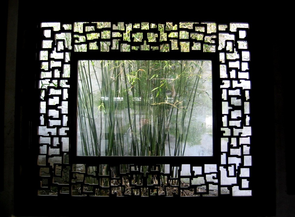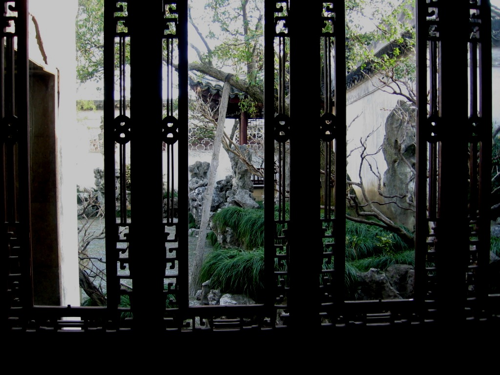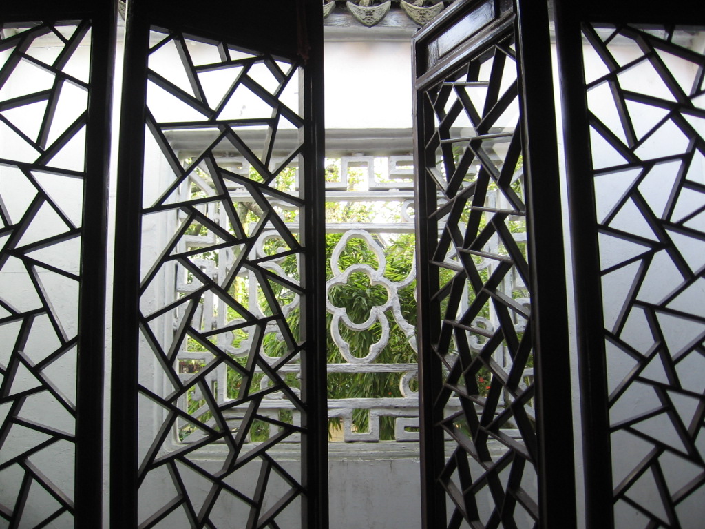 Some of the window ornamentation in this garden is fancier than that of the Blue Waters Pavilion as it was first built during a time when tastes were towards heavy decorations, similar, in a way, to European baroque. See the rockeries among the trees beyond this window, meant to bring the mountains into the city.