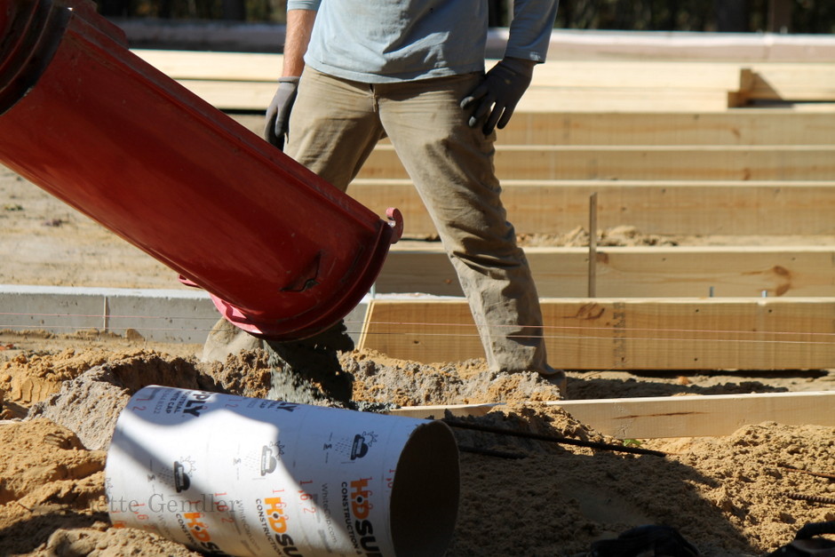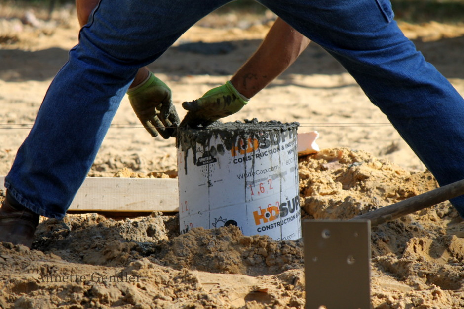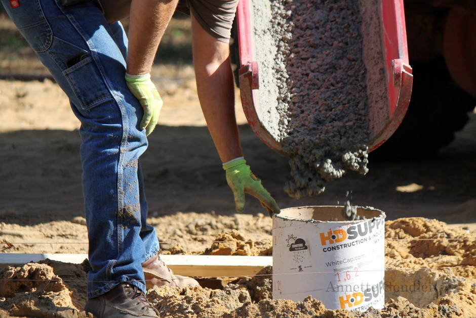 It’s slobbery work, pouring concrete to make one of the foundation pillars!