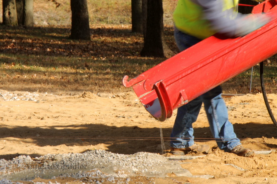 Then the concrete truck roars up. I’ve always loved the red and white trucks of the Ozinga concrete company, so I was thrilled to see one appearing at our site.