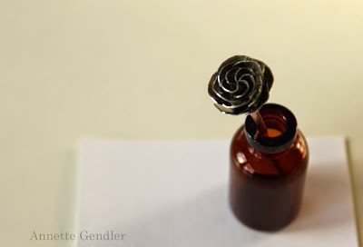 I just had to share this: My 17-year-old son gave me this for Mother's Day--a tiny rose he crafted from tin and copper, propped into the cutest little vase, namely one of his tiny apothecary jars (he's really a chemist). Goes to show that a lot of love can come in a tiny object.